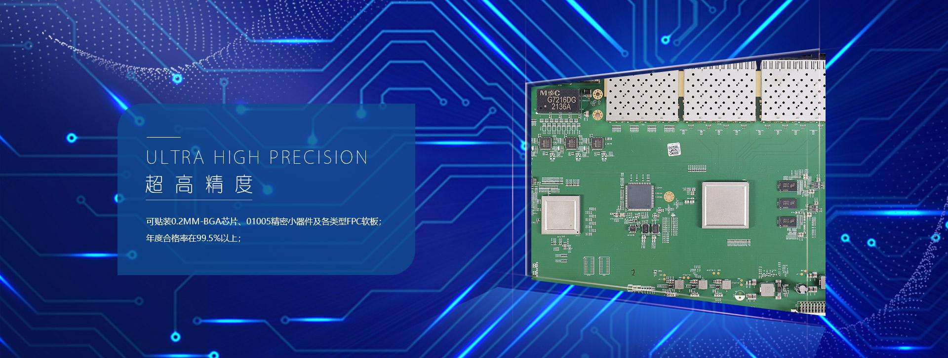 可貼裝0.2MM-BGA芯片、01005精密小器件及各類型FPC軟板,公司具備完備的質(zhì)量體系和行業(yè)所需全面的檢驗(yàn)設(shè)備,年度合格率統(tǒng)計(jì)均在99.5%以上。